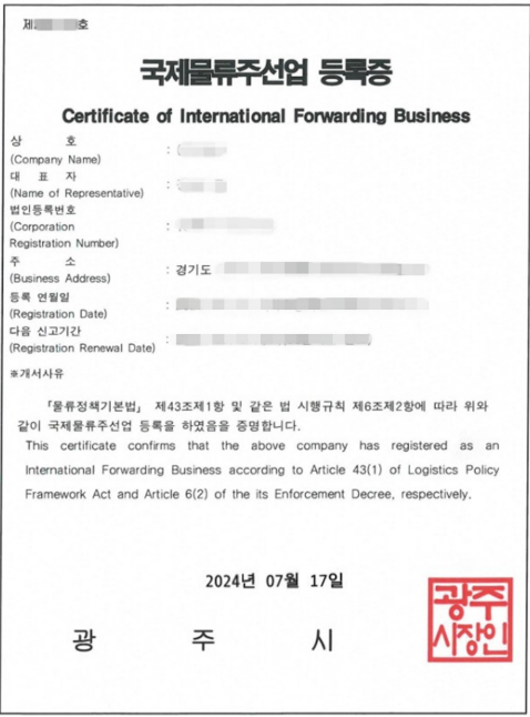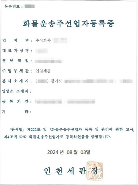 업체 고유의 세관코드 4자리는 기존 포워딩 업체들과 중복되지 않게 선택을 해야 합니다. 이후 화물운송주선업 등록이 승인되면 정식으로 사용할 수 있게 됩니다.