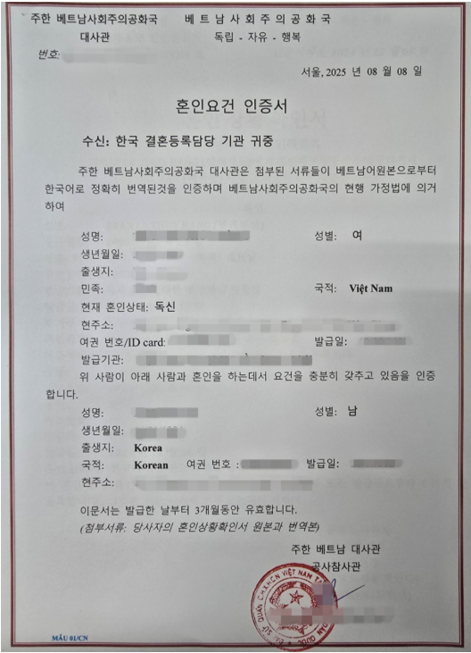 주한 베트남 대사관에서 혼인요건인증서를 발급 받으면 미혼증명서, 출생증명서, 신분증을 지참하여 구청에 혼인신고를 할 수 있습니다. 한국 구청에 혼인신고가 완료되면 혼인관계증명서에 베트남 배우자의 이름이 등재됩니다.