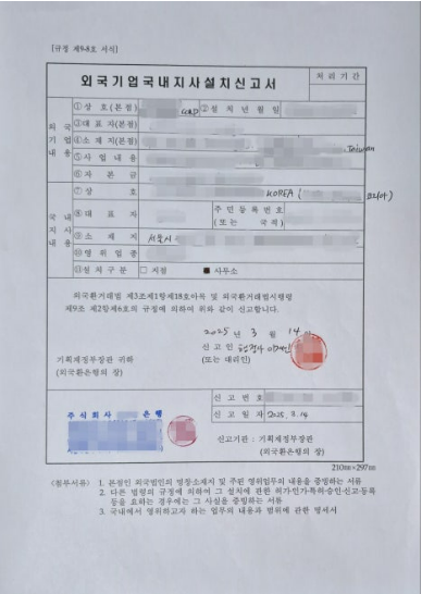 (4) 외국기업 국내지사 설치 신고 및 외국환거래은행 지정 신청 (행정사가 위임을 받아 신고해 드립니다.)