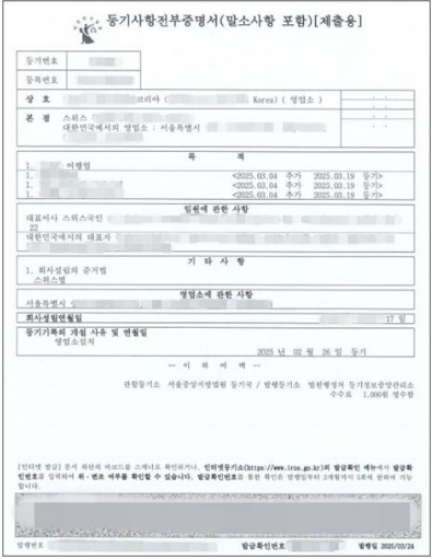 스위스 기업의 경우 국내지사 설치 및 외국환 은행 지정 신고를 마친 후 등기소에서 법인 등기를 완료하고 세무서에서 사업자등록증을 발급 받았습니다. 마지막으로 계좌 개설까지 마치고 업종 추가가 필요하다고 하셔서 여행업 등록을 진행하고 있습니다.