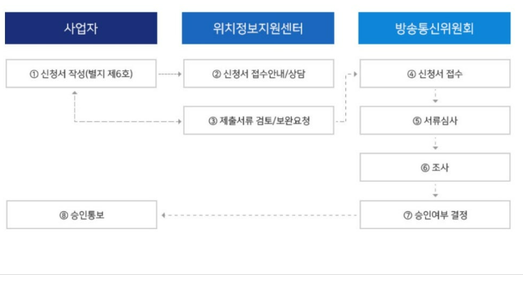 위치기반서비스사업 신고는 작성된 서류를 위치정보지원센터에서 선검토하여 보완이 이루어진 후 방송통신위원회에 정식으로 신고서류를 제출하게 됩니다. 이후 방통위 심사를 통과하게 되면 승인처리가 되어 위치기반서비스사업신고확인증이 발급됩니다.